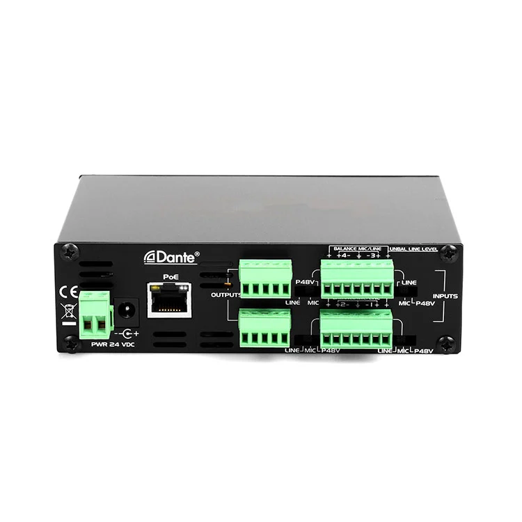 อินเทอร์เฟซ Dante อินพุต 4 MIC และ LINE เป็นอินเตอร์เฟสเสียงระดับมืออาชีพที่ใช้โปรโตคอลเครือข่าย Dante ซึ่งรองรับอินพุตไมโครโฟน/บรรทัด 4 ตัวและเอาต์พุต 4 เอาต์พุต ข้อได้เปรียบหลักคือการส่งสัญญาณเสียงที่มีคุณภาพสูงและมีความถี่ต่ำผ่านเครือข่าย IP ซึ่งเหมาะสำหรับสถานการณ์ที่ต้องใช้การเดินสายที่ยืดหยุ่นการส่งสัญญาณระยะไกลหรือการรวมเสียงหลายช่องทาง