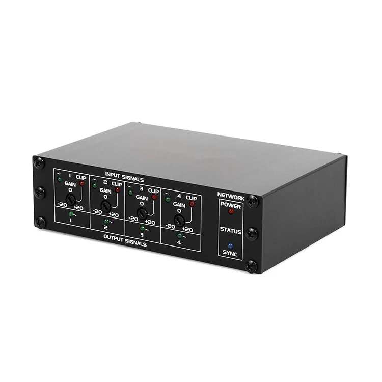 DB0404 เป็นอินเทอร์เฟซ Dante คุณภาพสูงที่มีอินพุตแบบอะนาล็อกสี่อินพุต (สลับระหว่าง MIC/Line พร้อมการควบคุมอัตราขยายและพลังงาน Phantom) และเอาต์พุตอะนาล็อกที่สมดุลสี่ตัว-ทั้งหมดสามารถกำหนดเส้นทางได้อย่างสมบูรณ์ผ่าน Dante